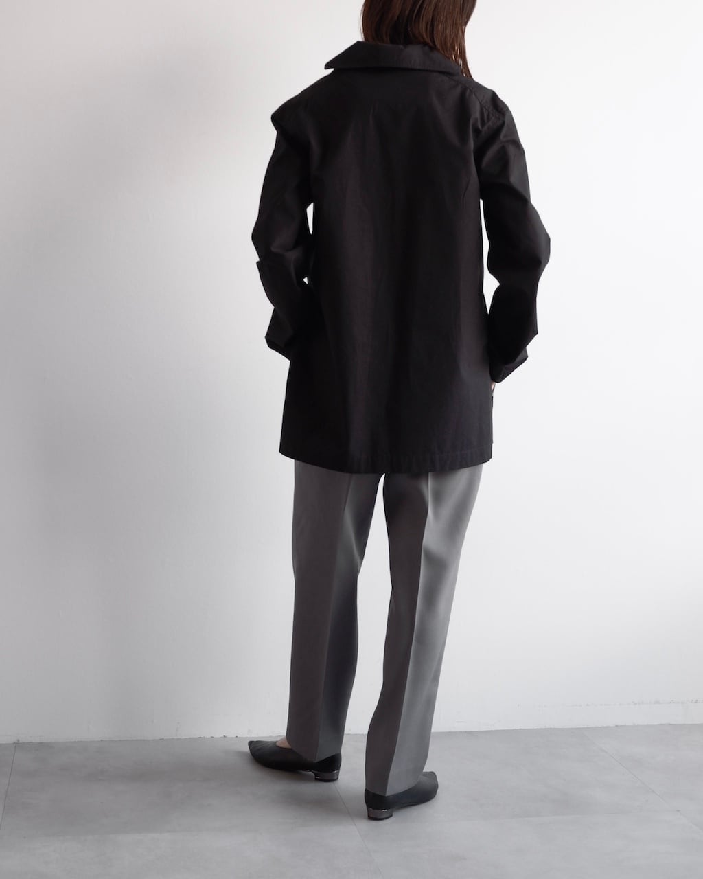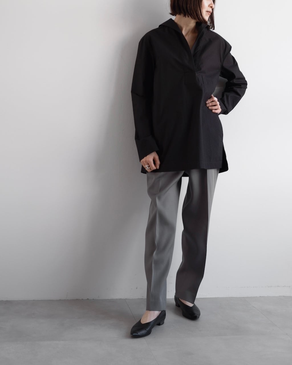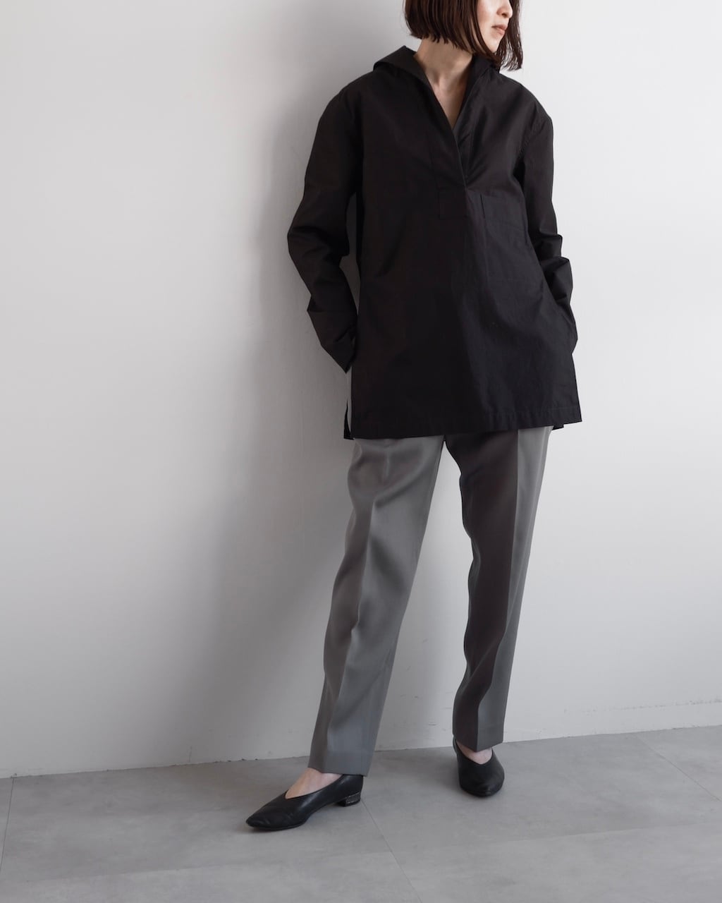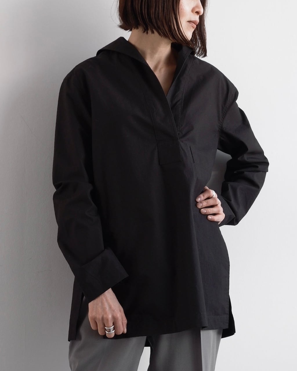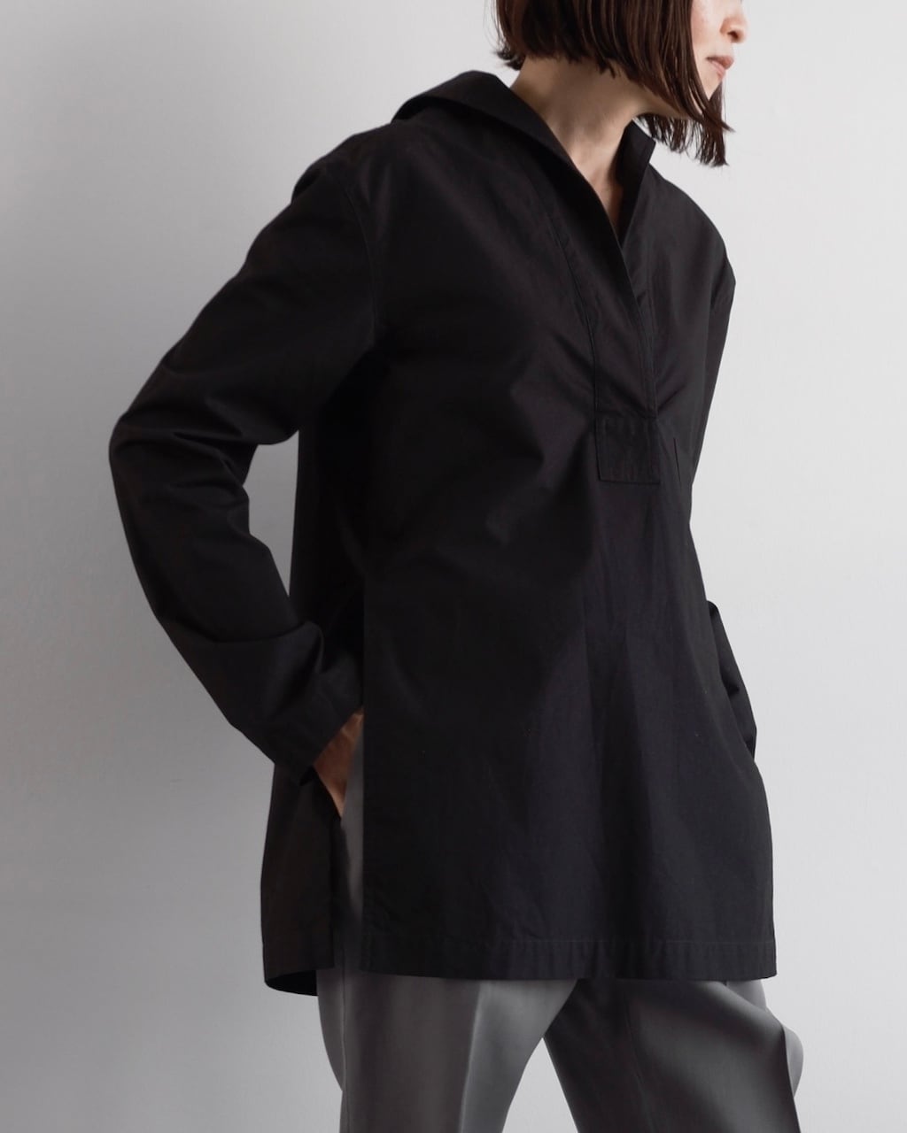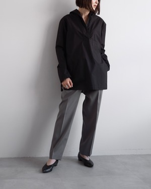 ボタンのないミニマルなフロントが首元に自然な抜けを生み、着るだけで洗練されたニュアンスを纏える一着です。