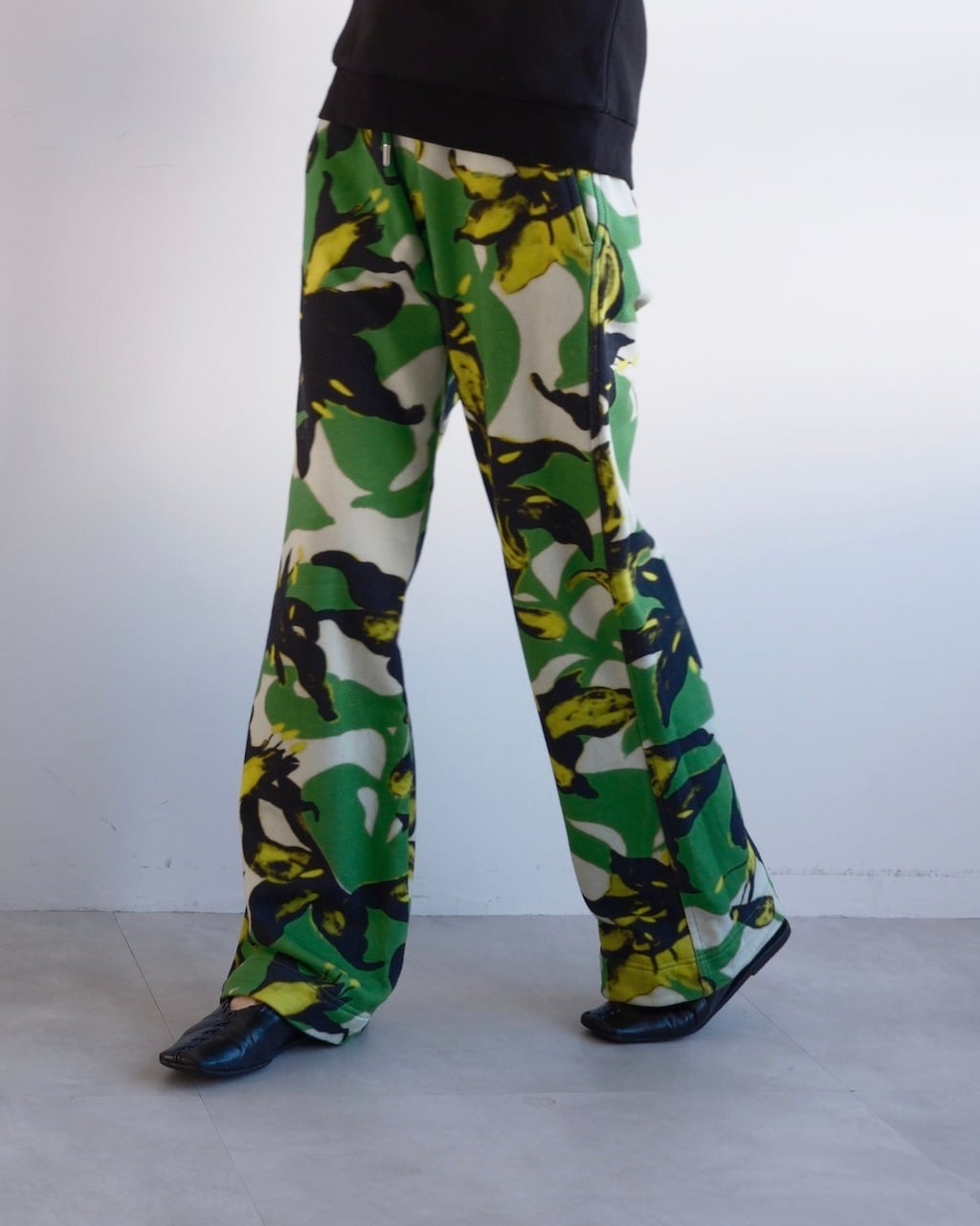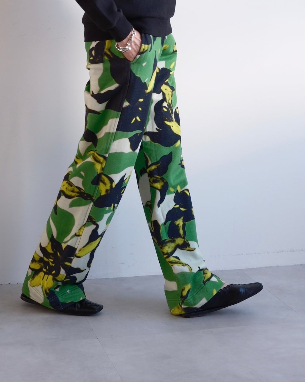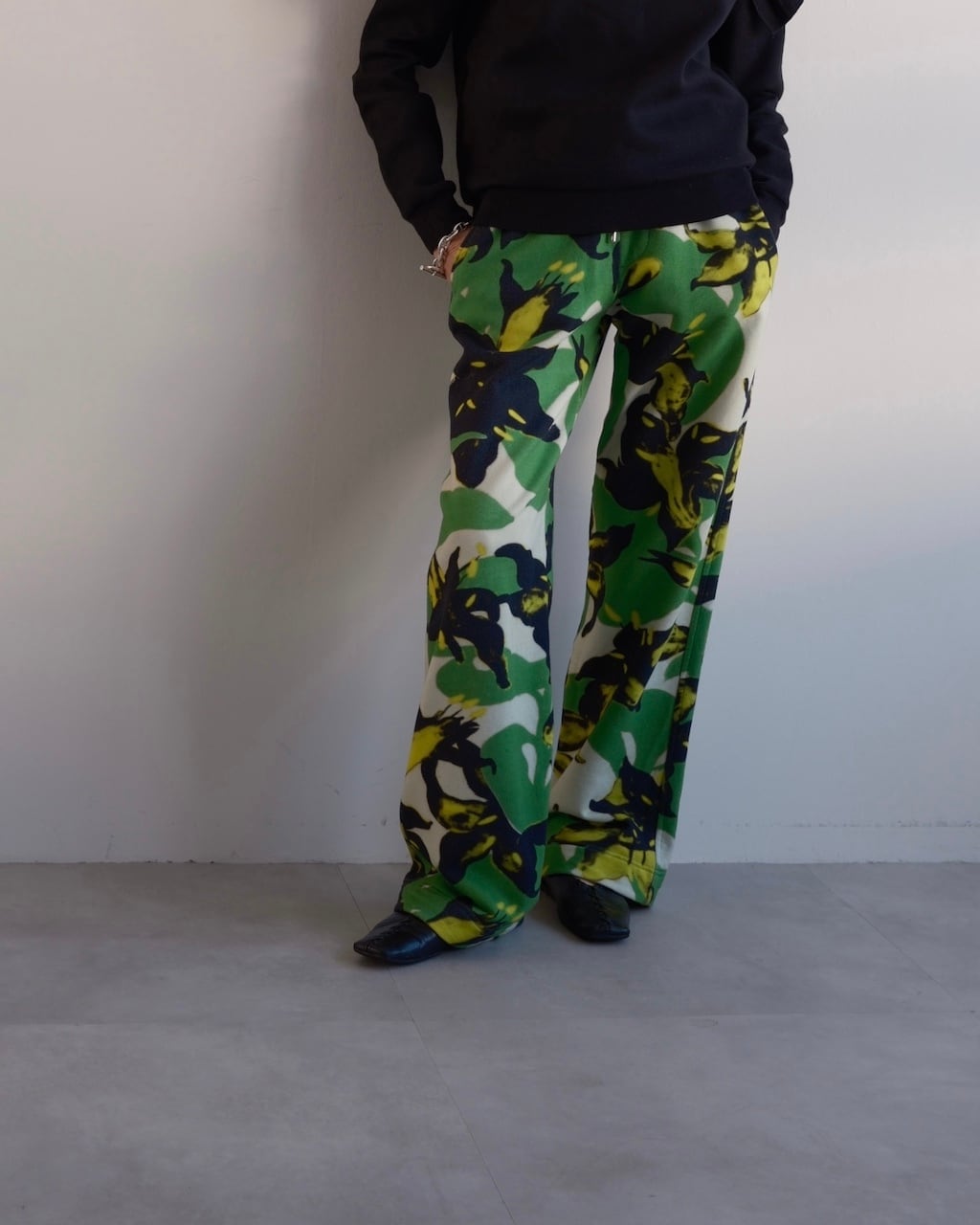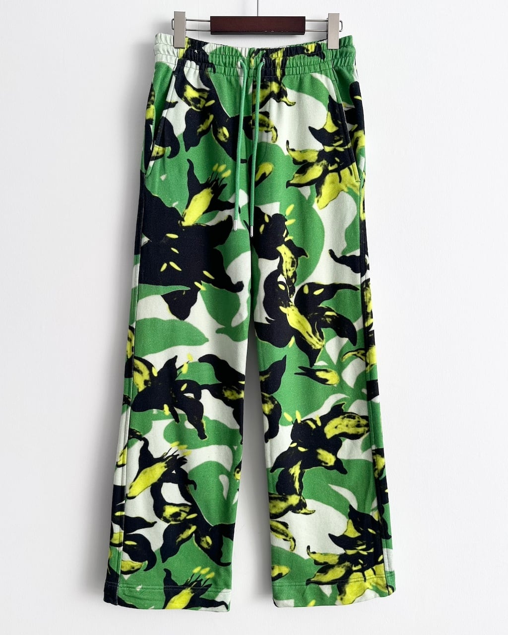 グリーンを基調に、ブラックとイエローのフローラルモチーフが大胆に配されたDRIES VAN NOTENのスウェットパンツ。