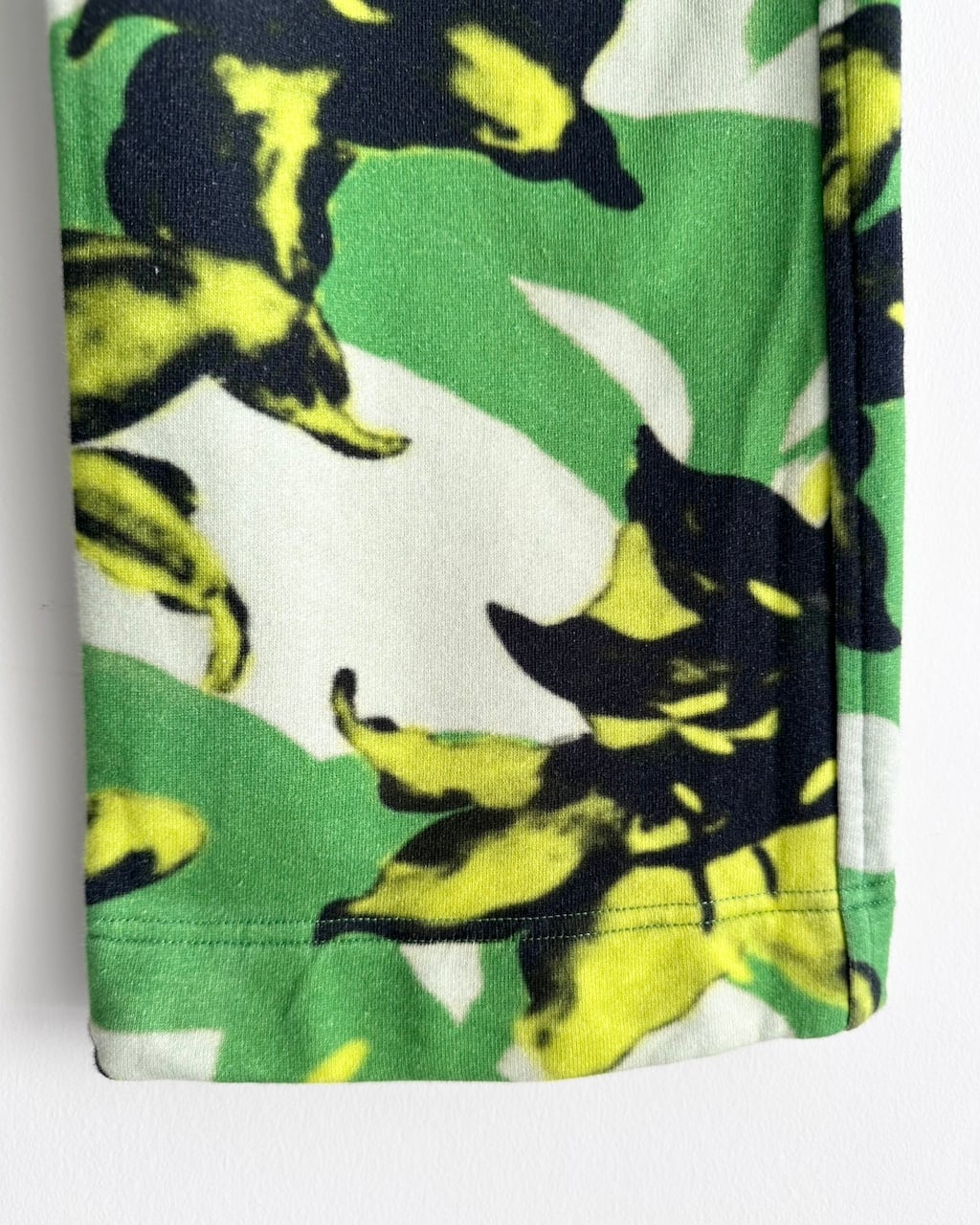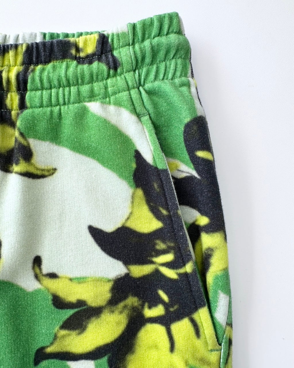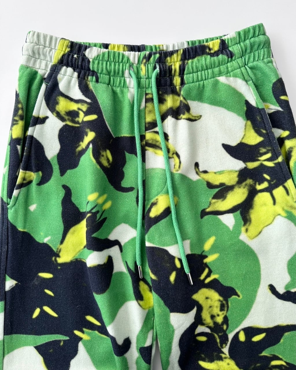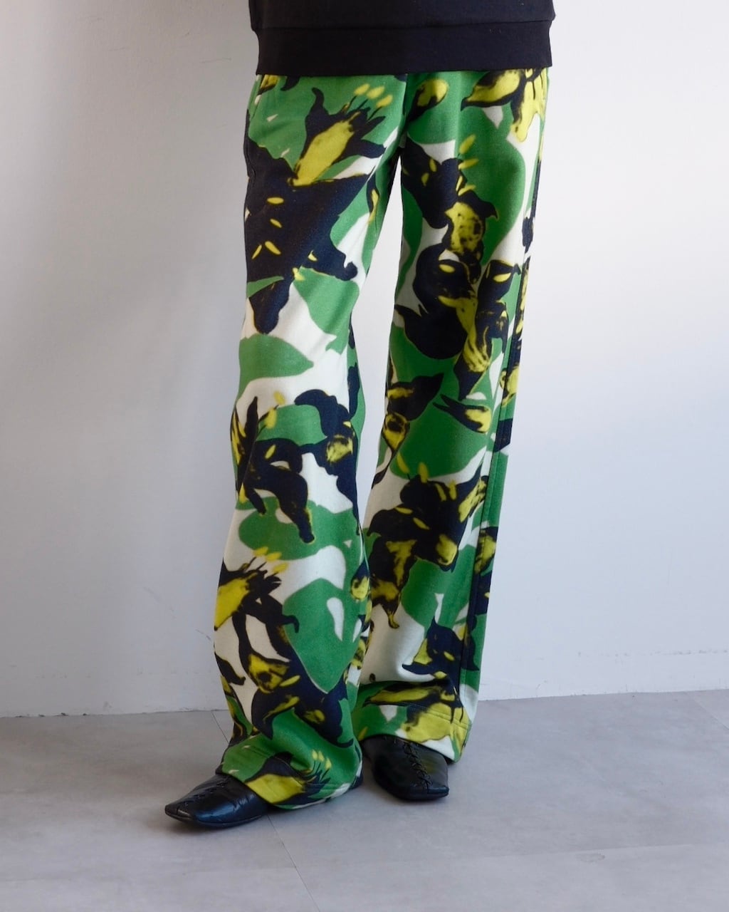 グリーンを基調に、ブラックとイエローのフローラルモチーフが大胆に配されたDRIES VAN NOTENのスウェットパンツ。