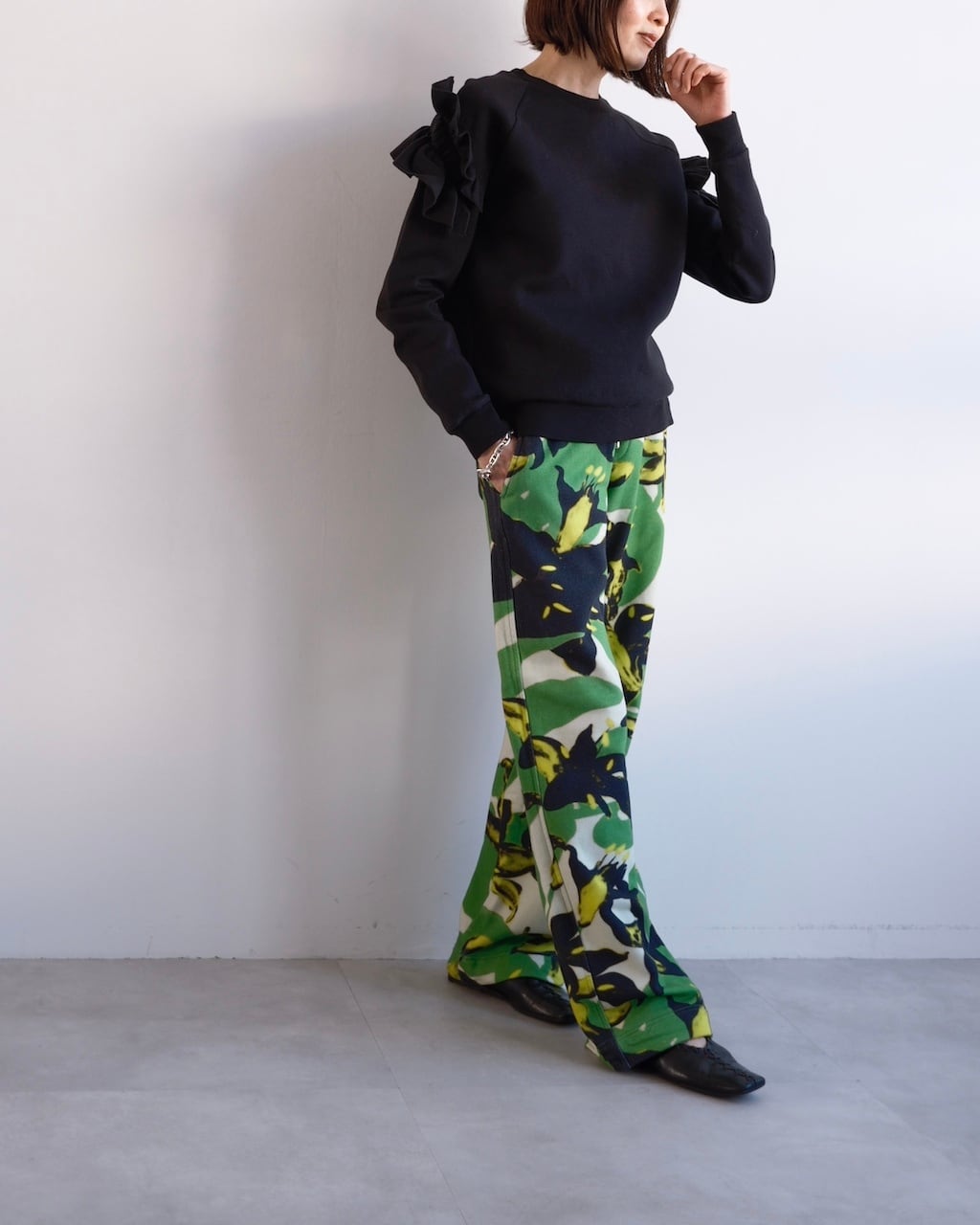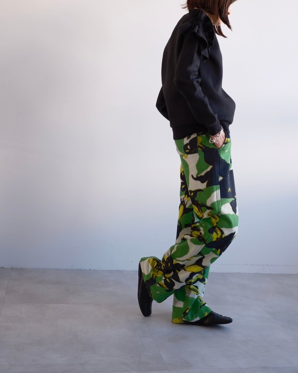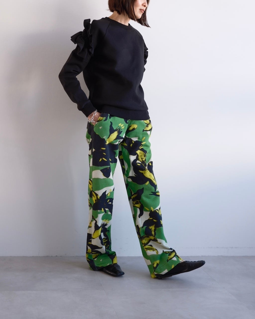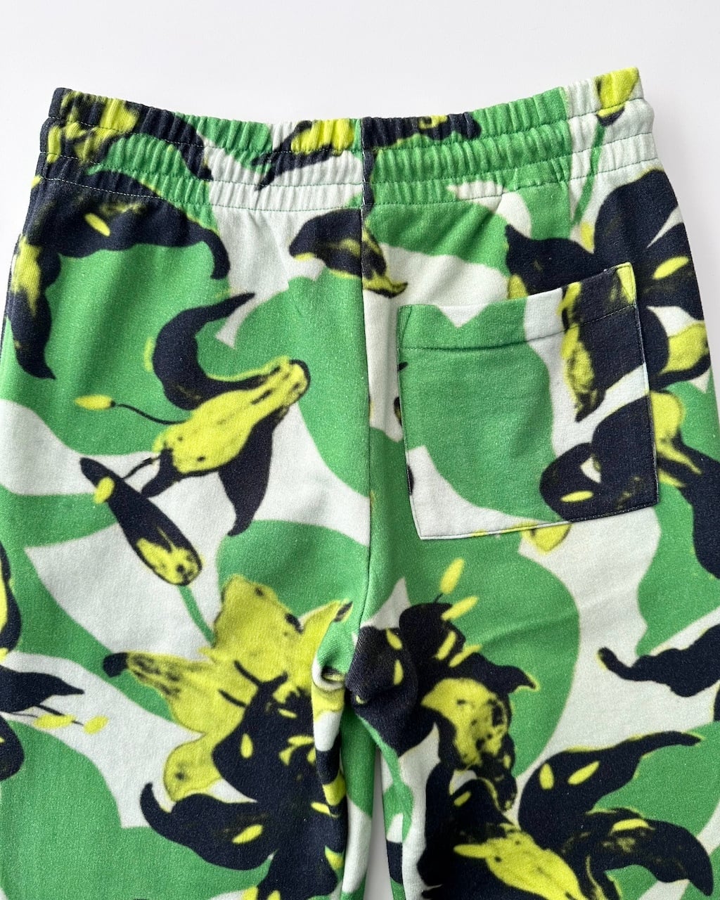 グリーンを基調に、ブラックとイエローのフローラルモチーフが大胆に配されたDRIES VAN NOTENのスウェットパンツ。