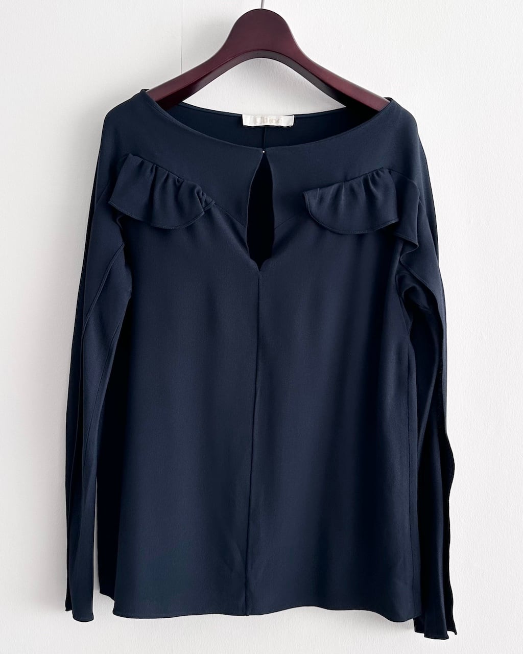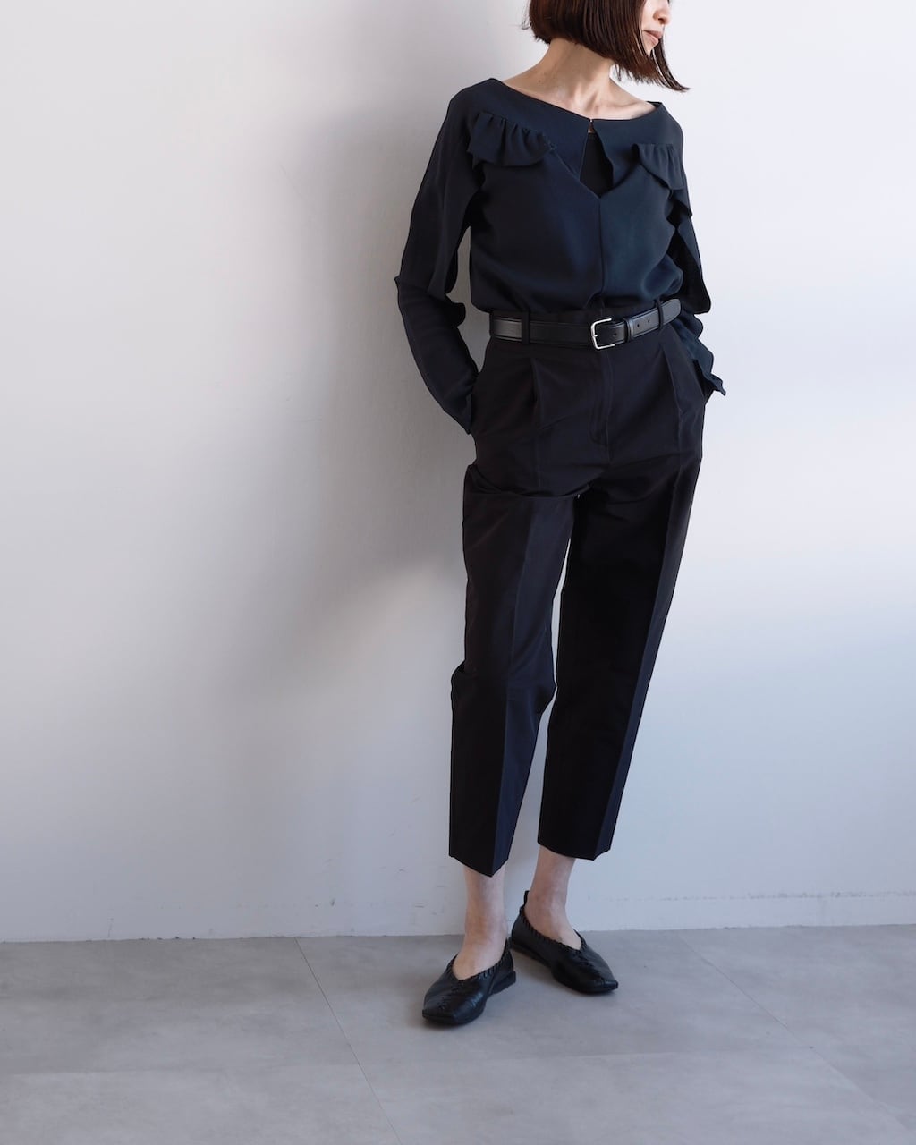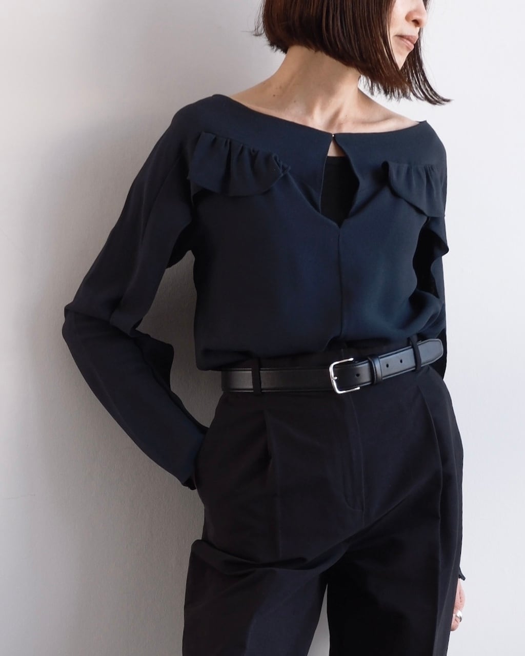 ネック下から袖にかけてあしらわれたフリルは、控えめなボリュームで流れるように配置され、動きに合わせて立体感を生み出します。