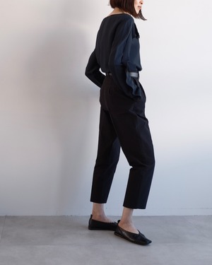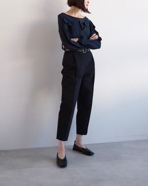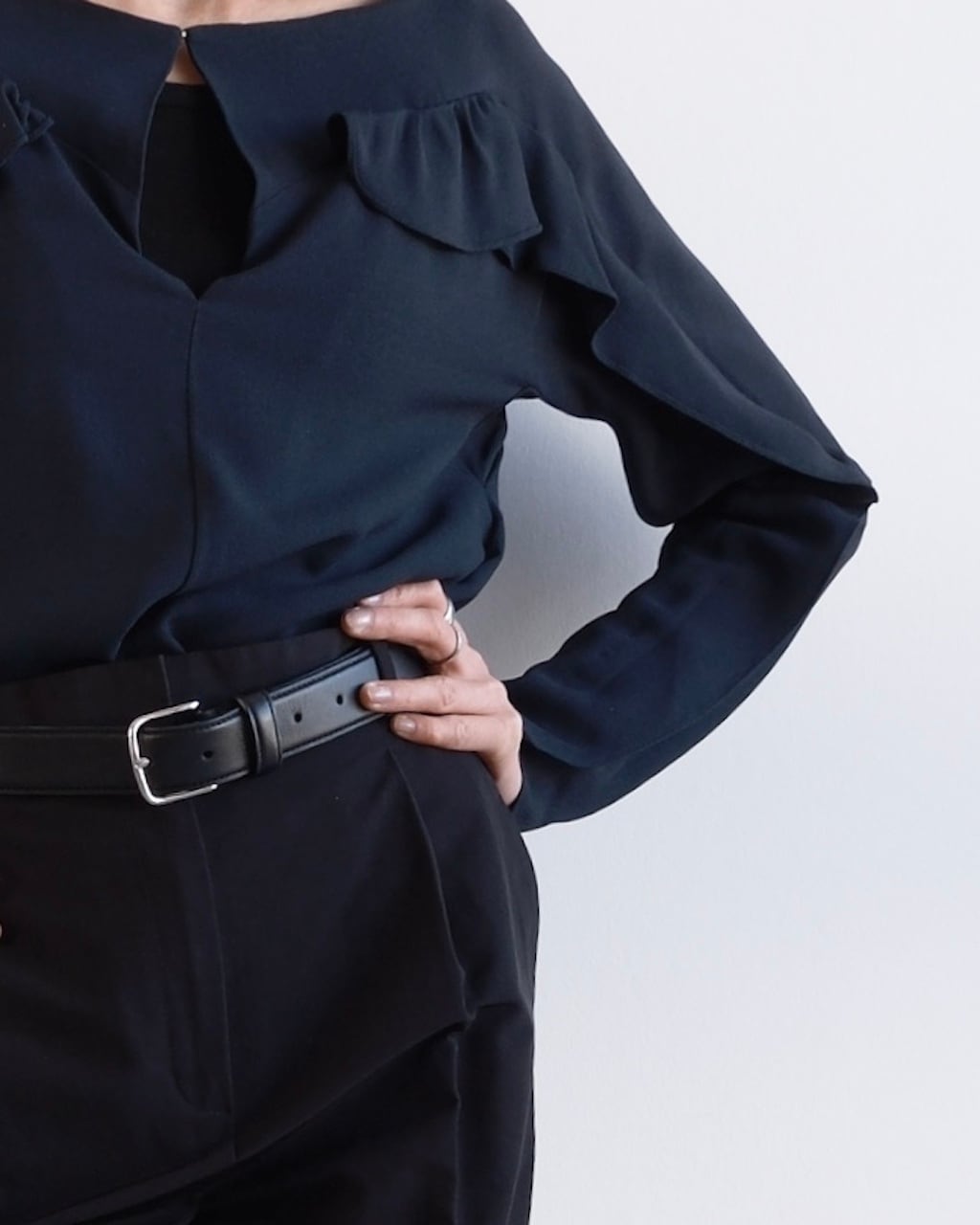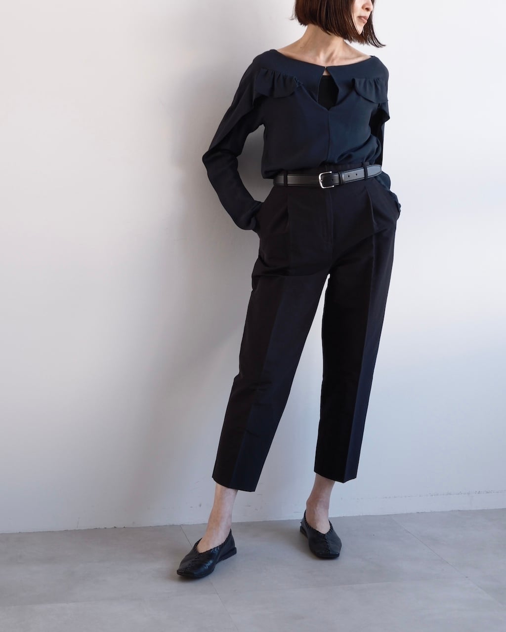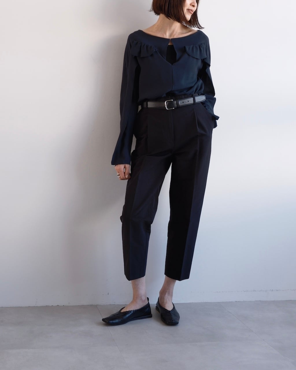 ネック下から袖にかけてあしらわれたフリルは、控えめなボリュームで流れるように配置され、動きに合わせて立体感を生み出します。