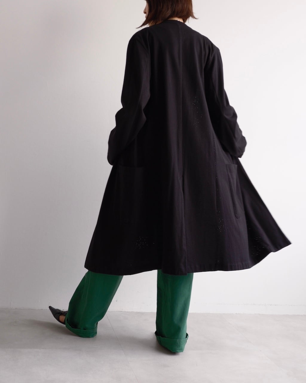 後ろにスリットが入っており、ボタンを閉じても足捌きよく着ていただけます。