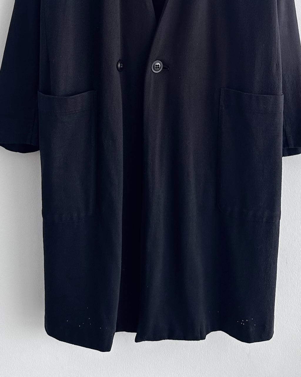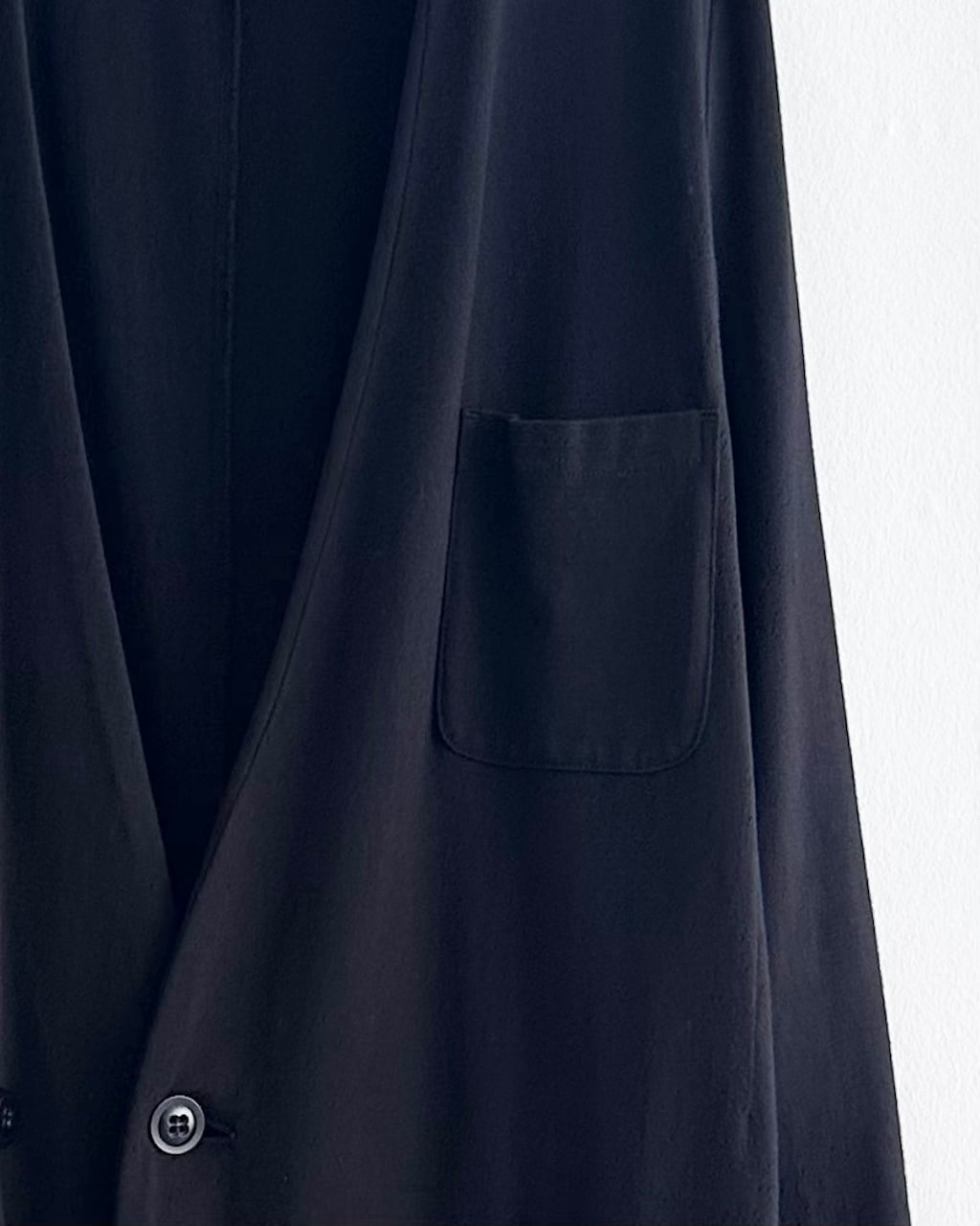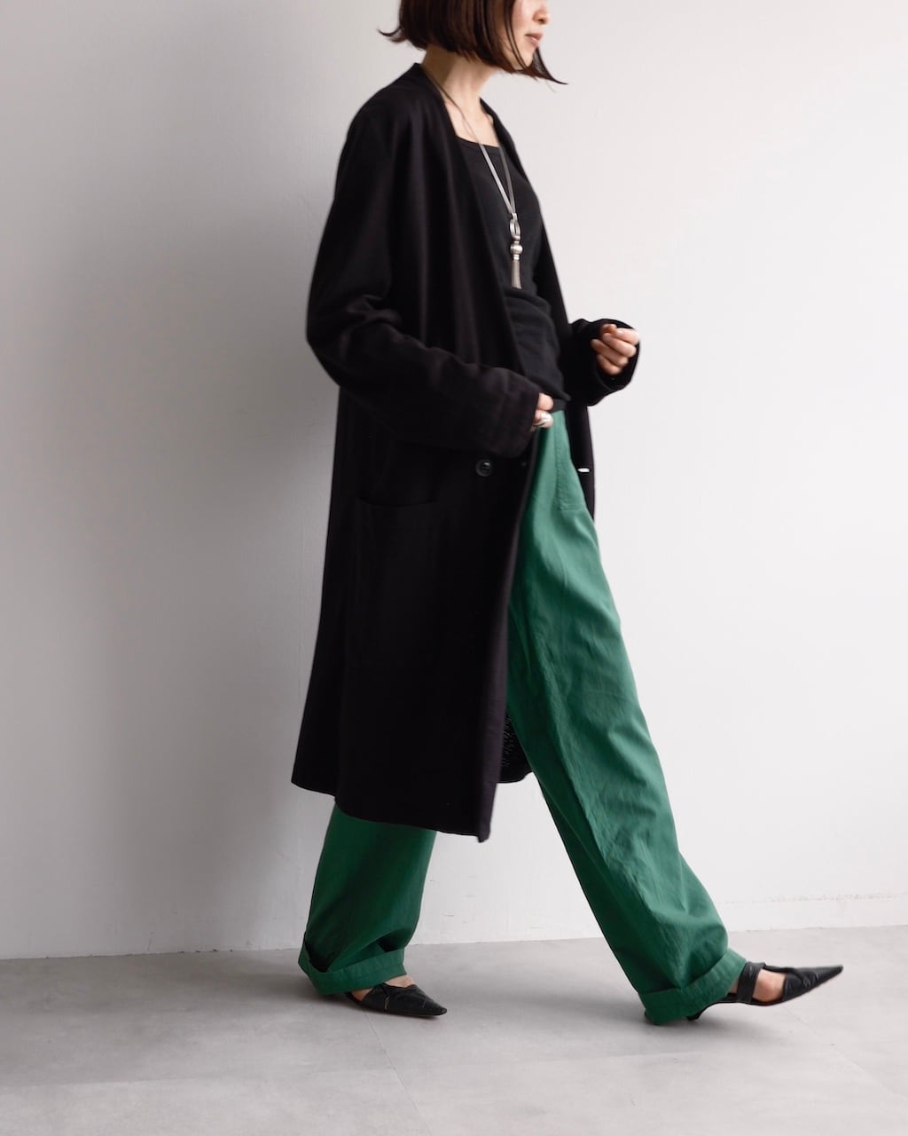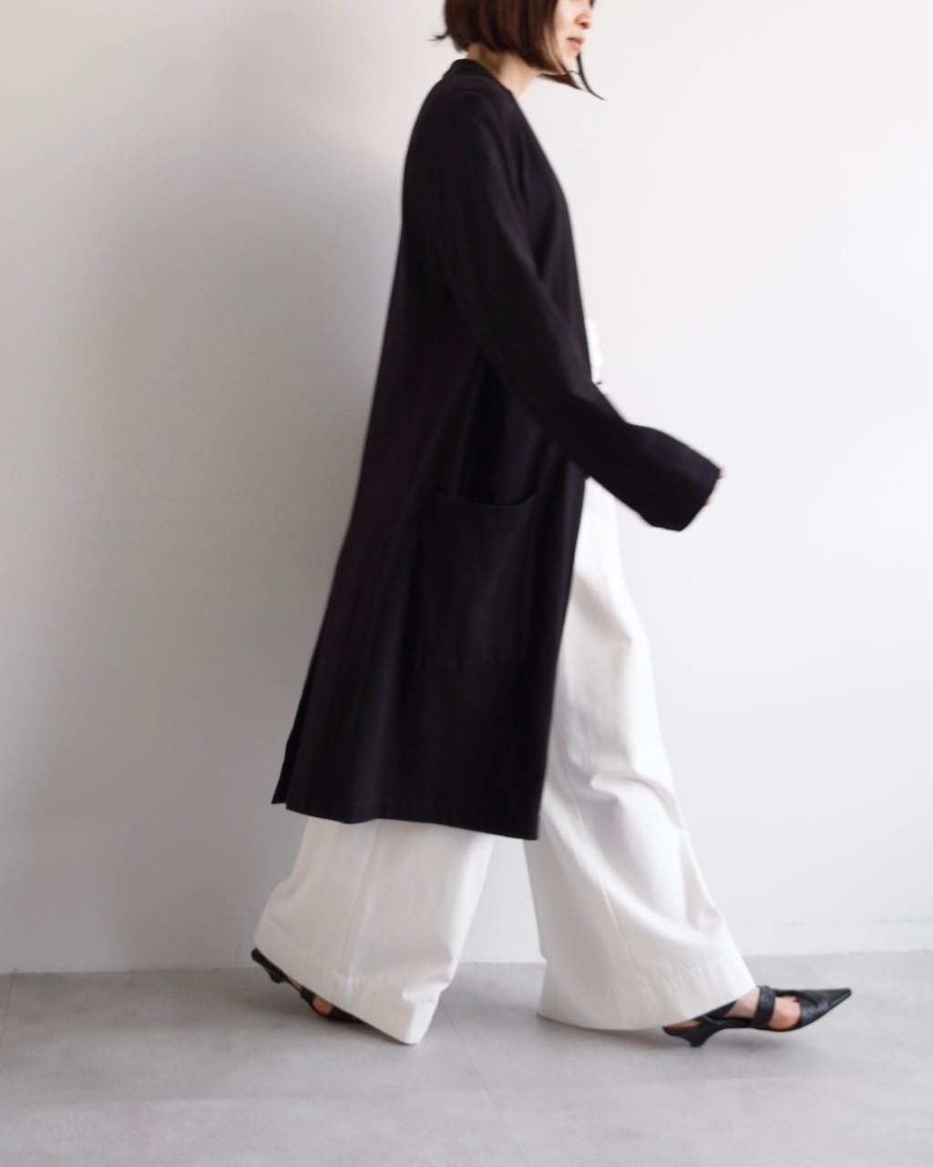 深く開いたフロントと落ち感のあるシルエットが、ミニマルながら印象的な一着です。