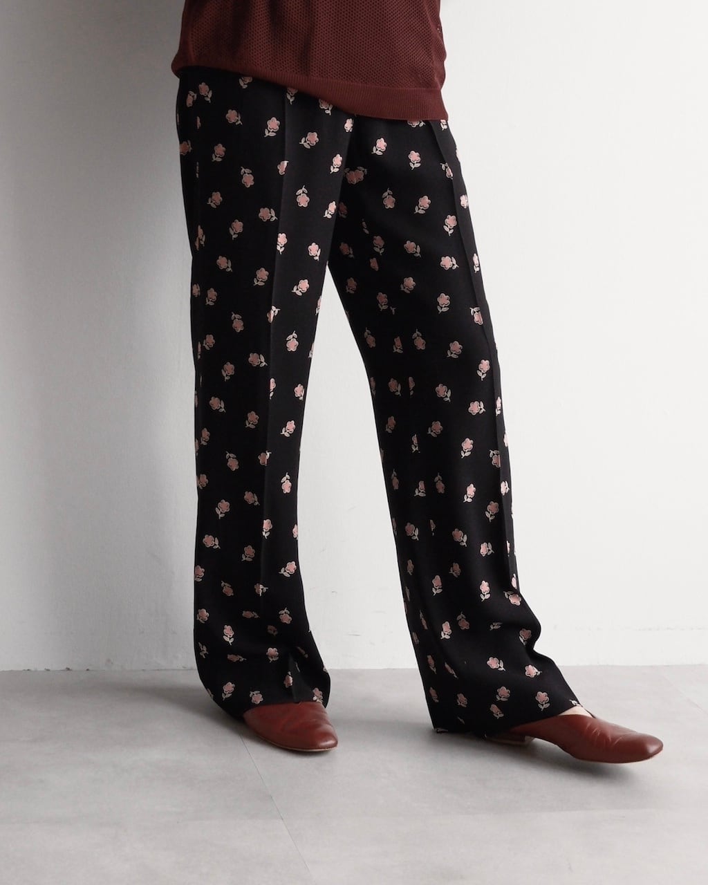 愛らしいモチーフの花柄を主役にしながら、落ち感のあるシルエットで、甘くなりすぎないバランスでまとめられた一本です。