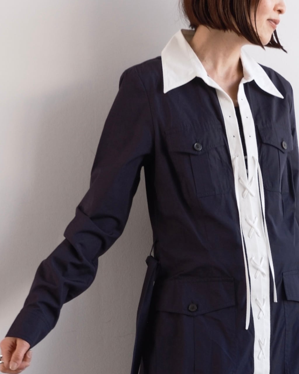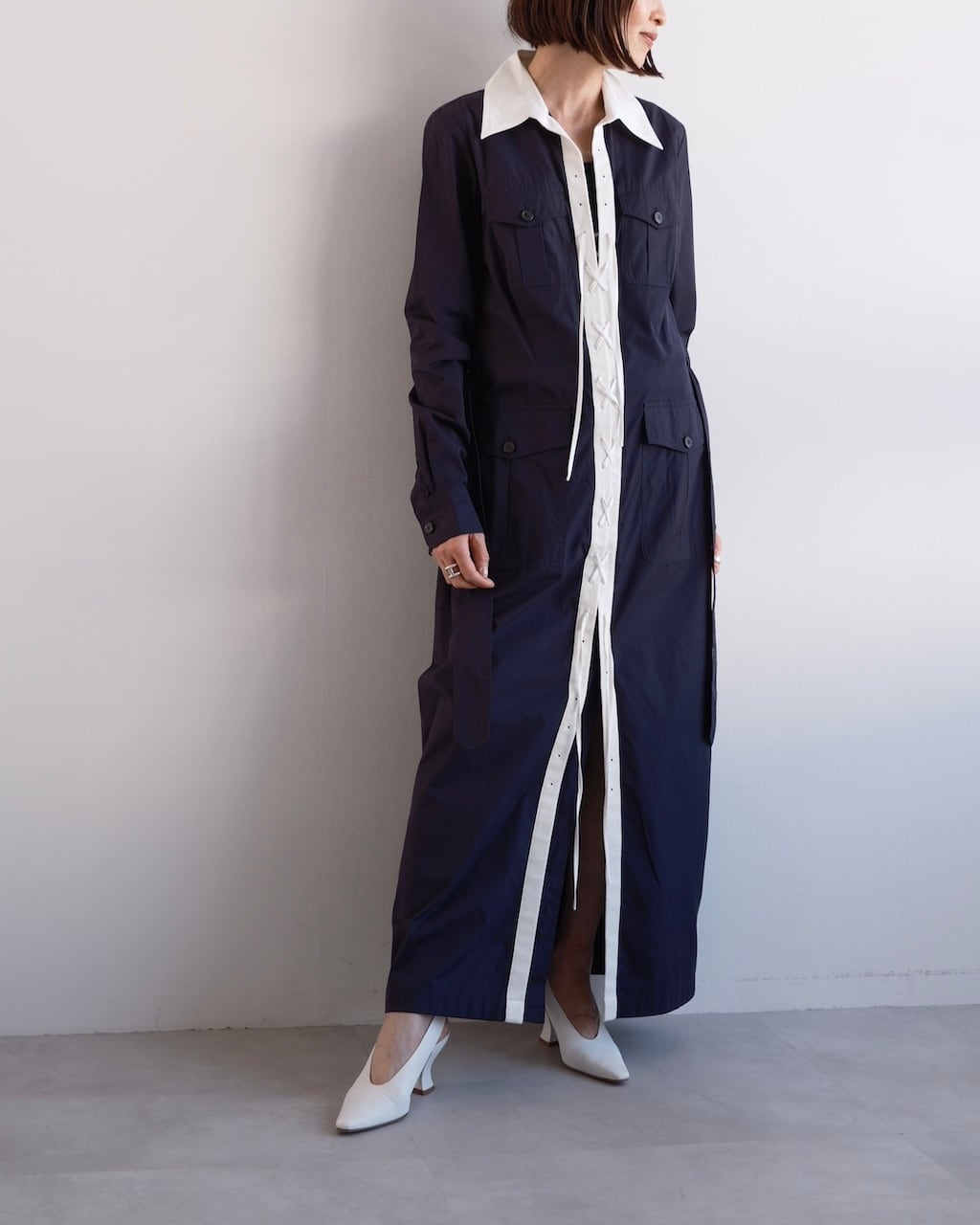 レースアップとワークの要素が重なり、DRIES VAN NOTENらしい雰囲気のあるワンピースに仕上がっています。