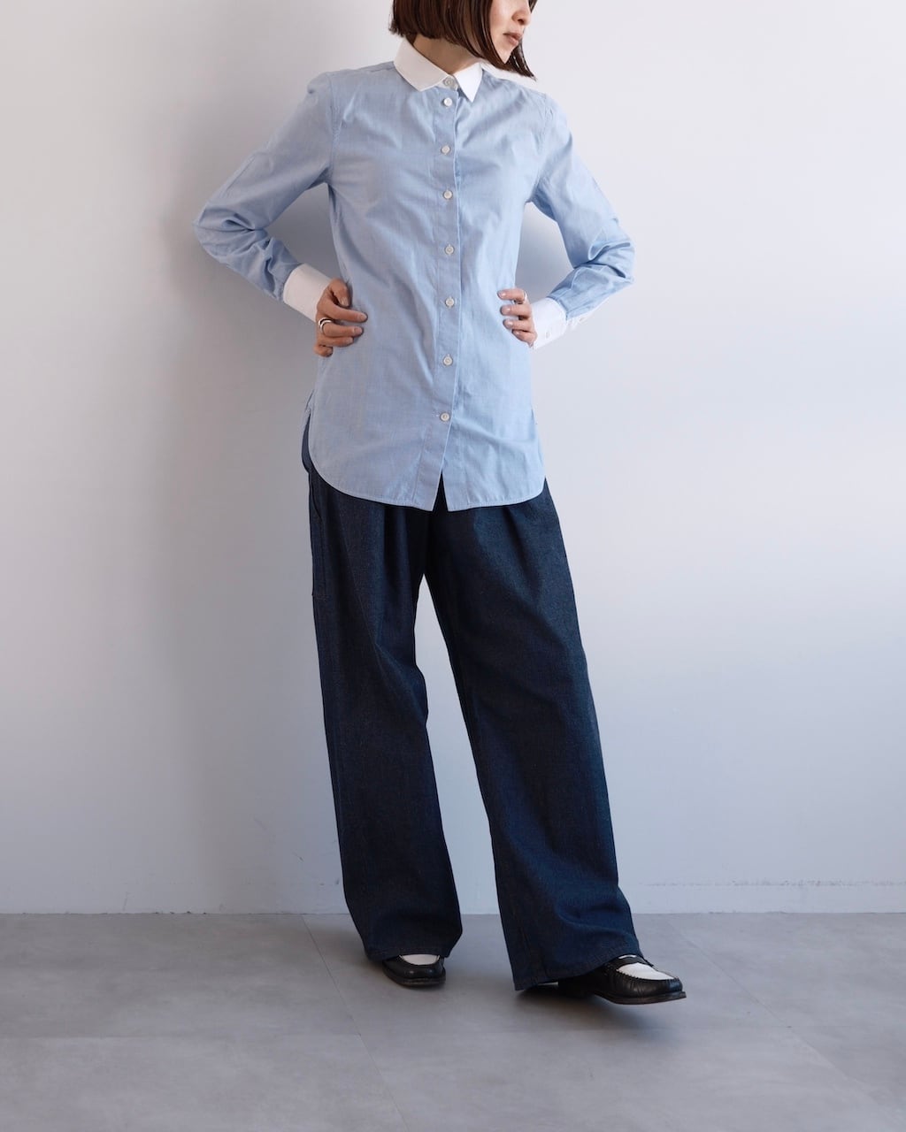 襟とカフスの白とブルーのやわらかな色味との対比が、クリーンで知的な雰囲気を引き立てています。