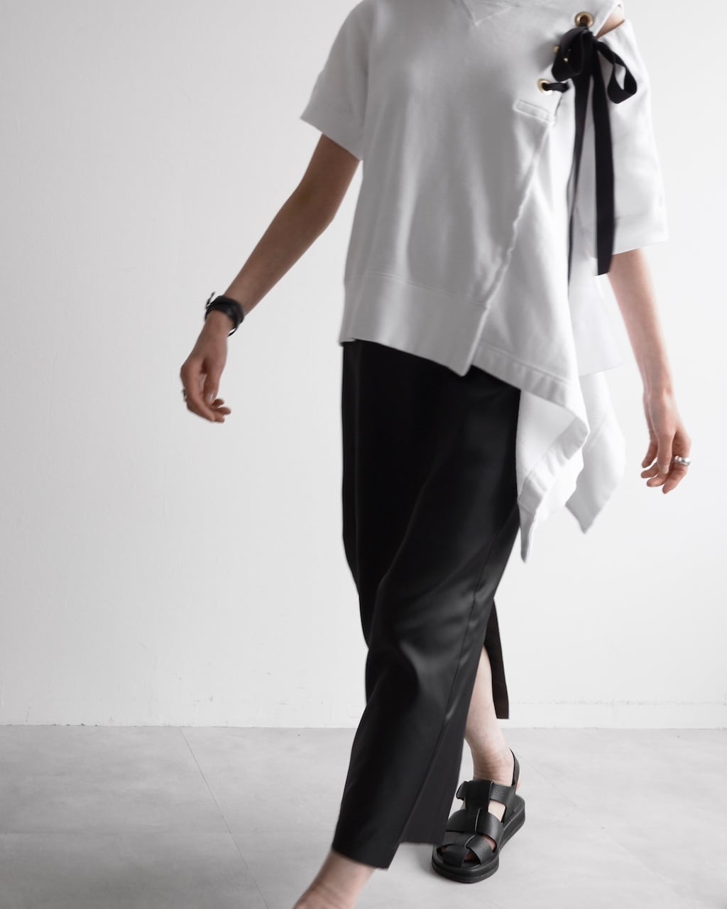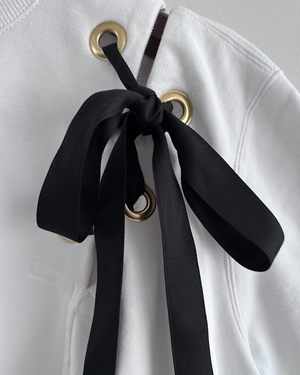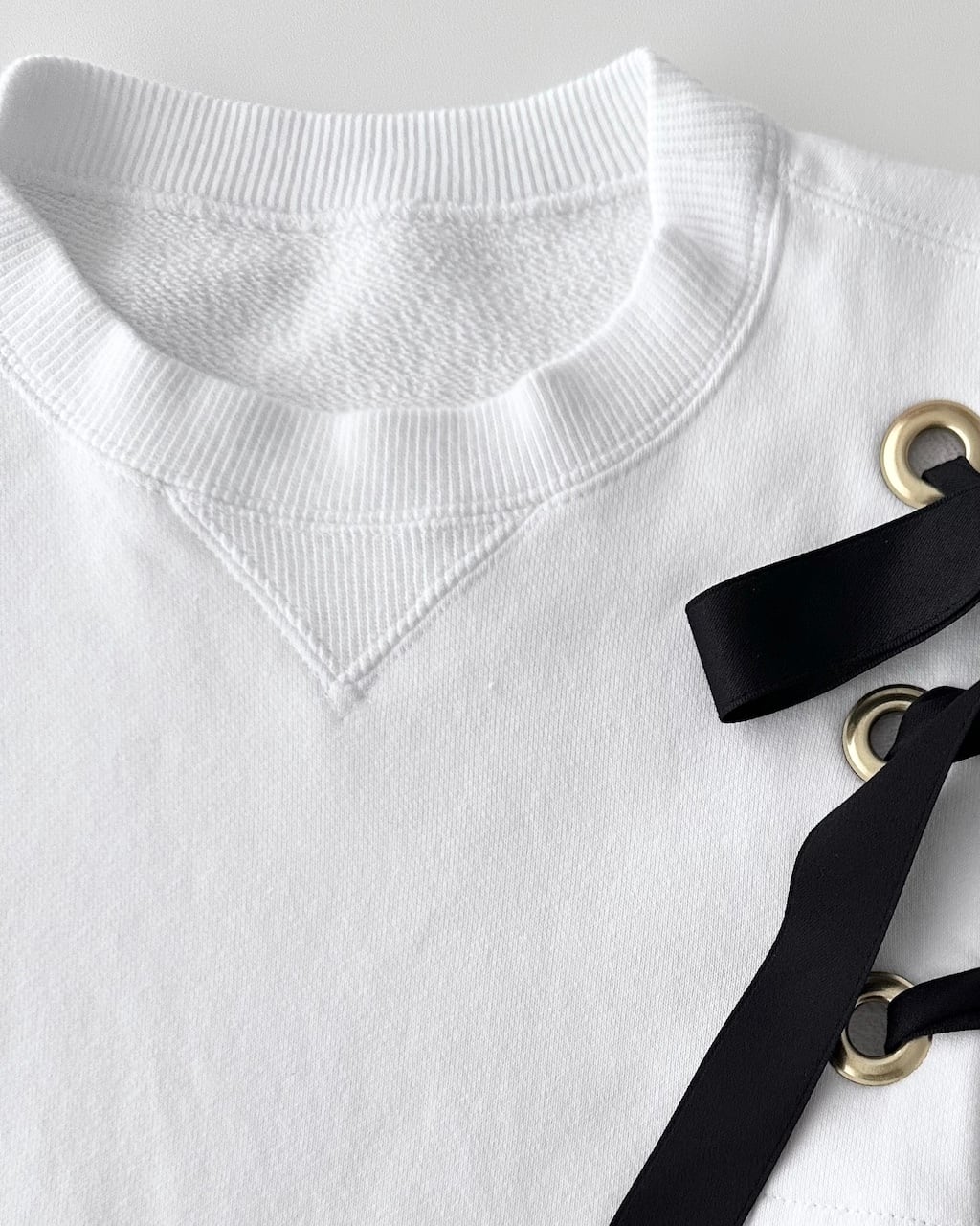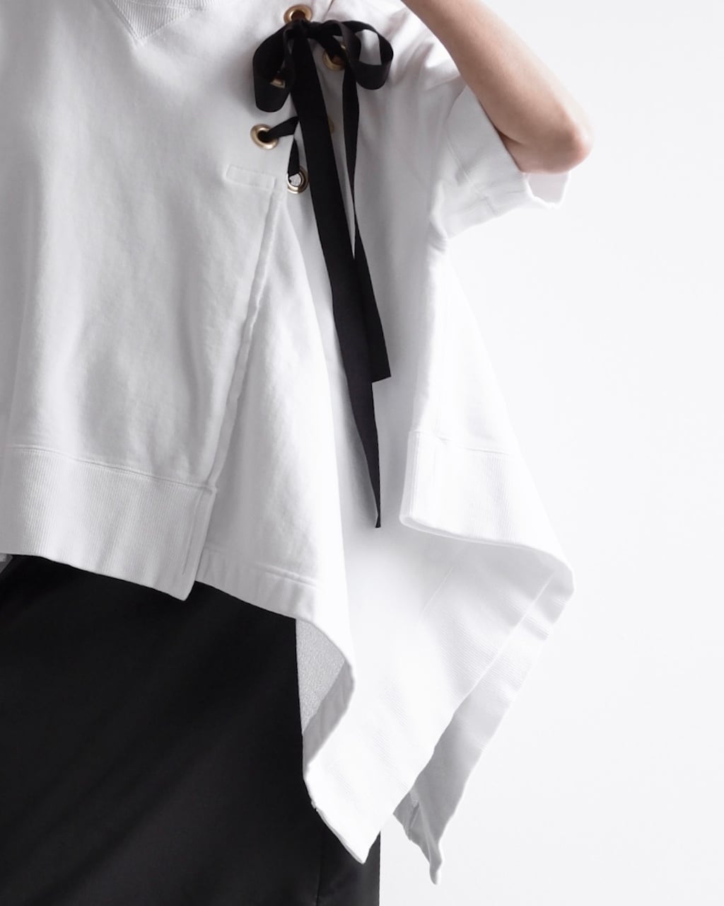 クルーネックの半袖スウェットをベースに、ゴールドの大きなハトメに通されたブラックのリボンがアクセントとなる一着。
