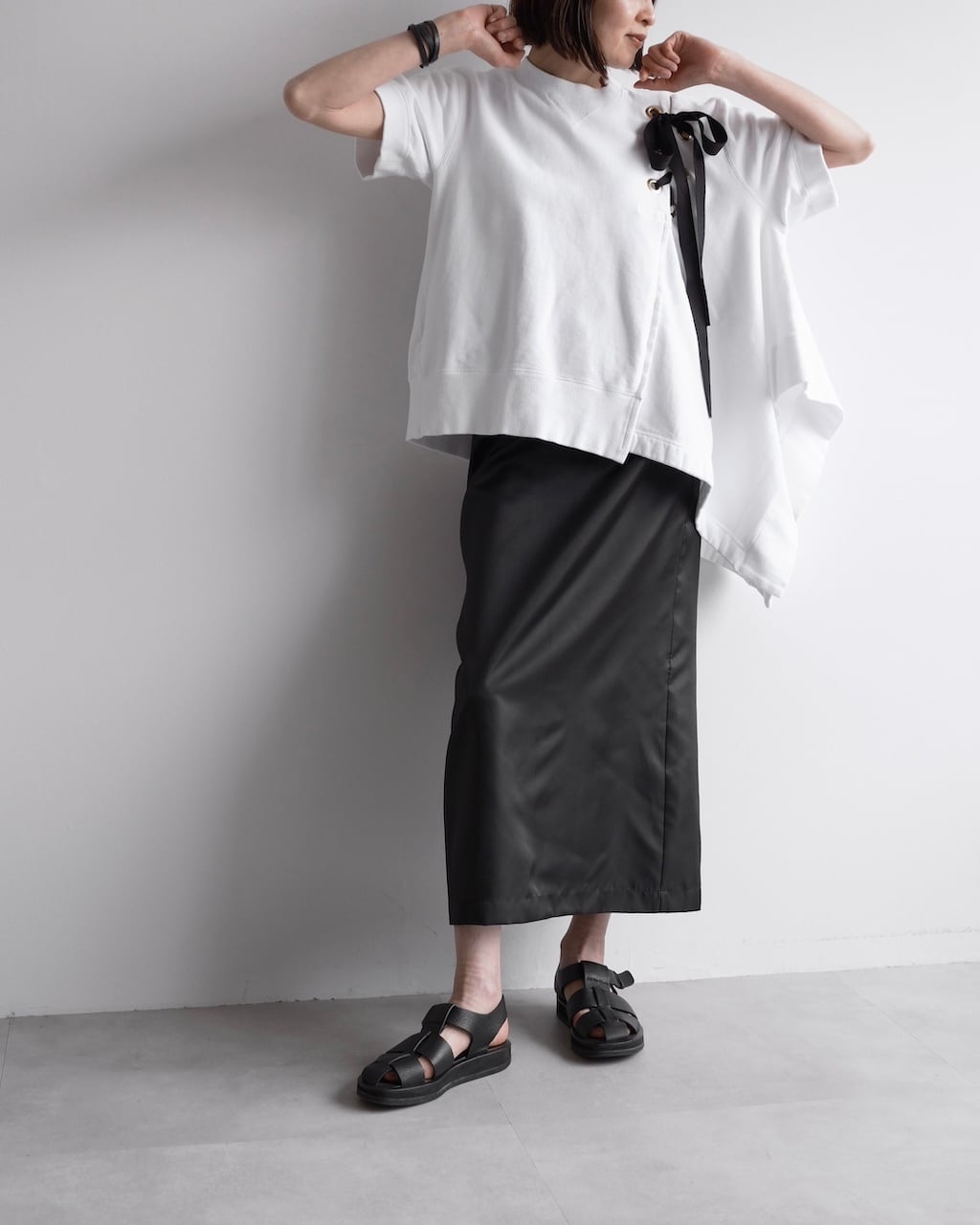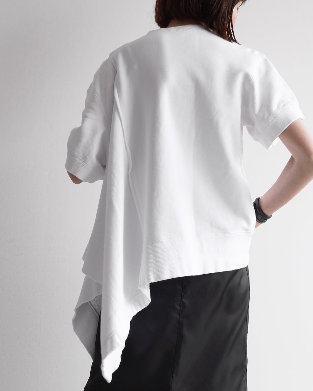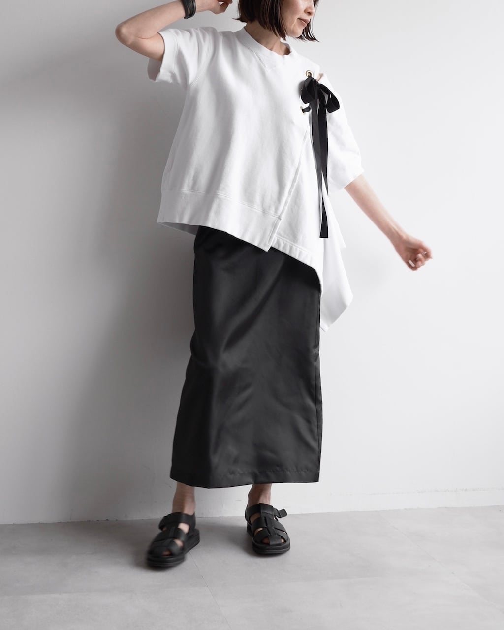 黒のリボンやアシンメトリーのシルエットが視線を引き寄せ、カジュアルなスウェットの印象を大きく変える一着です。