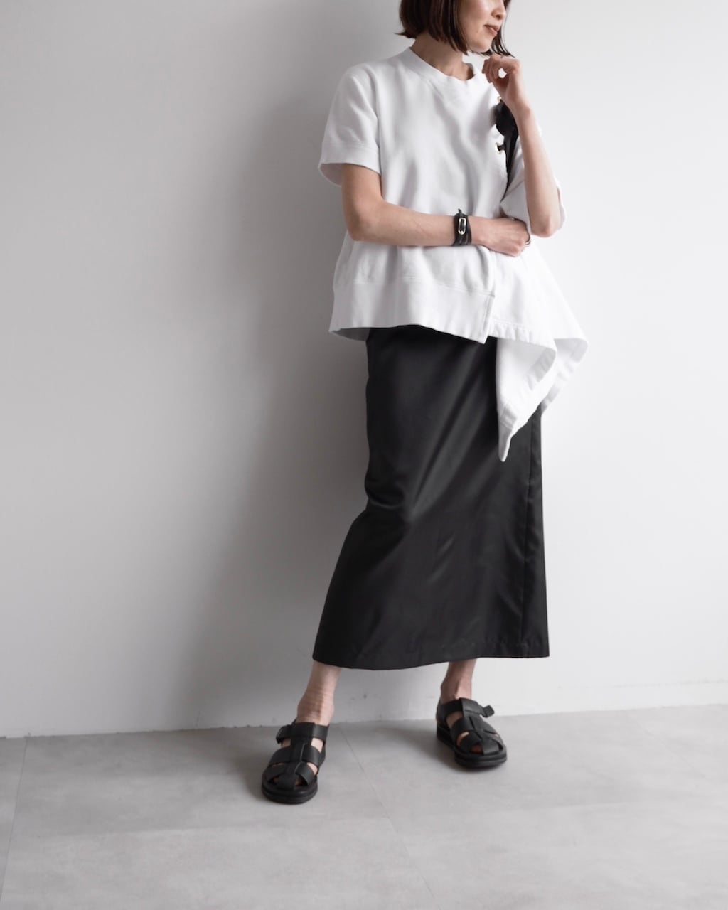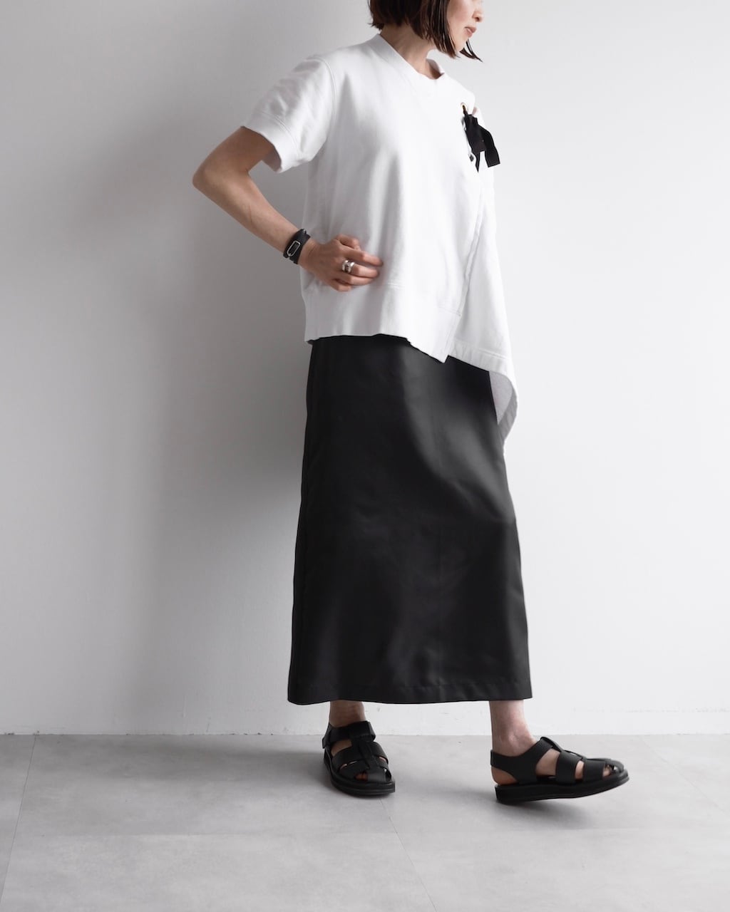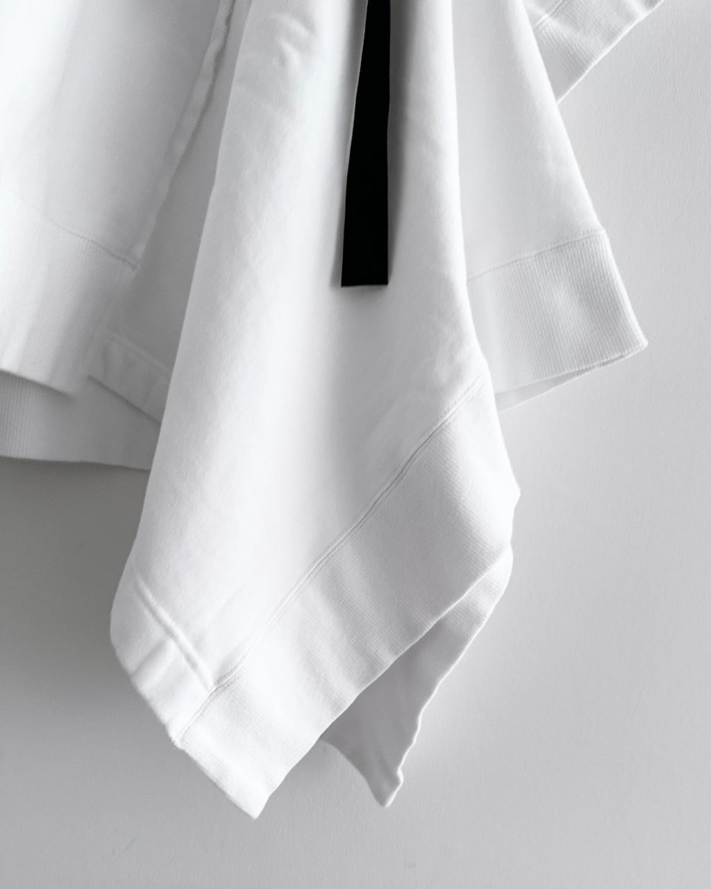 黒のリボンやアシンメトリーのシルエットが視線を引き寄せ、カジュアルなスウェットの印象を大きく変える一着です。