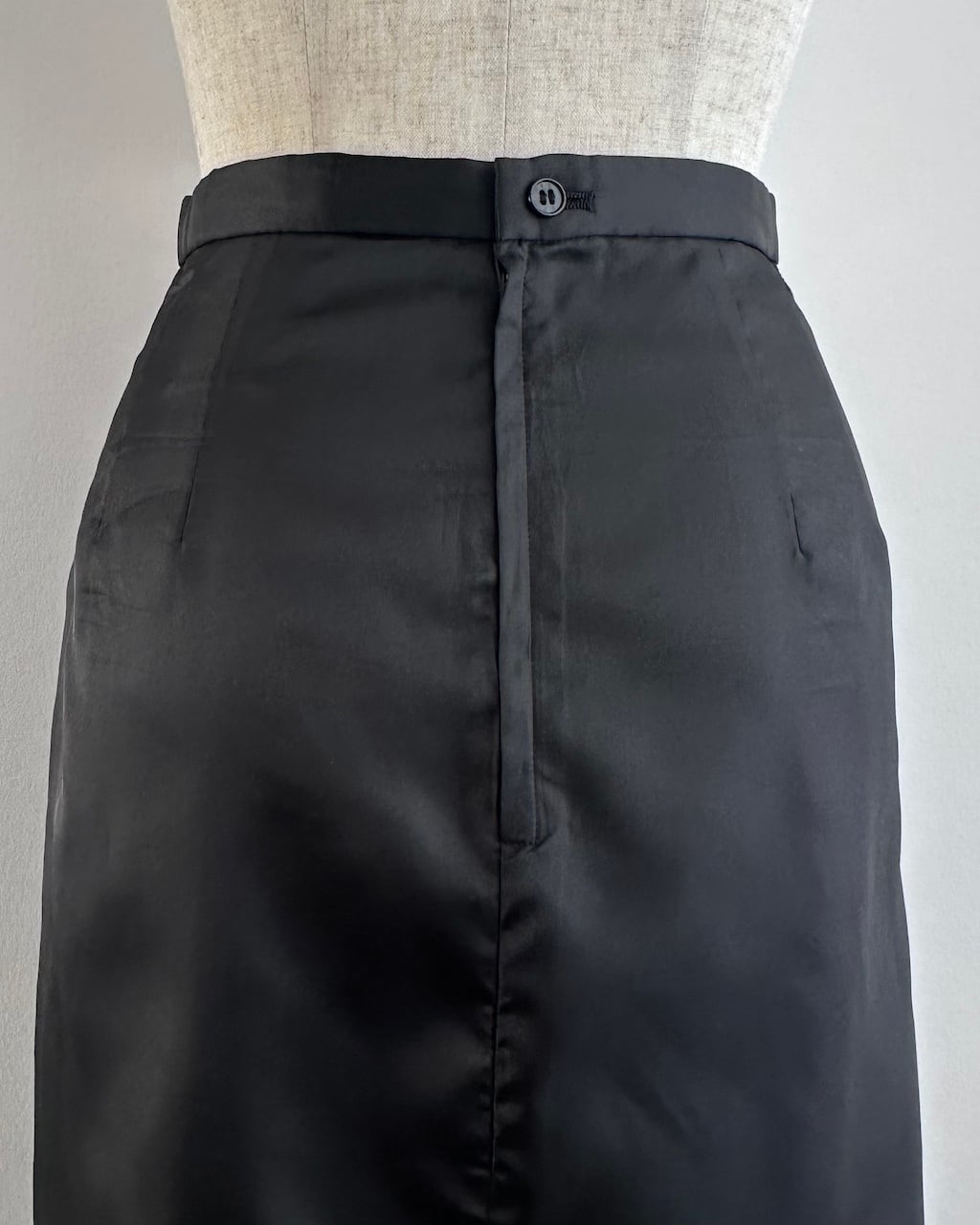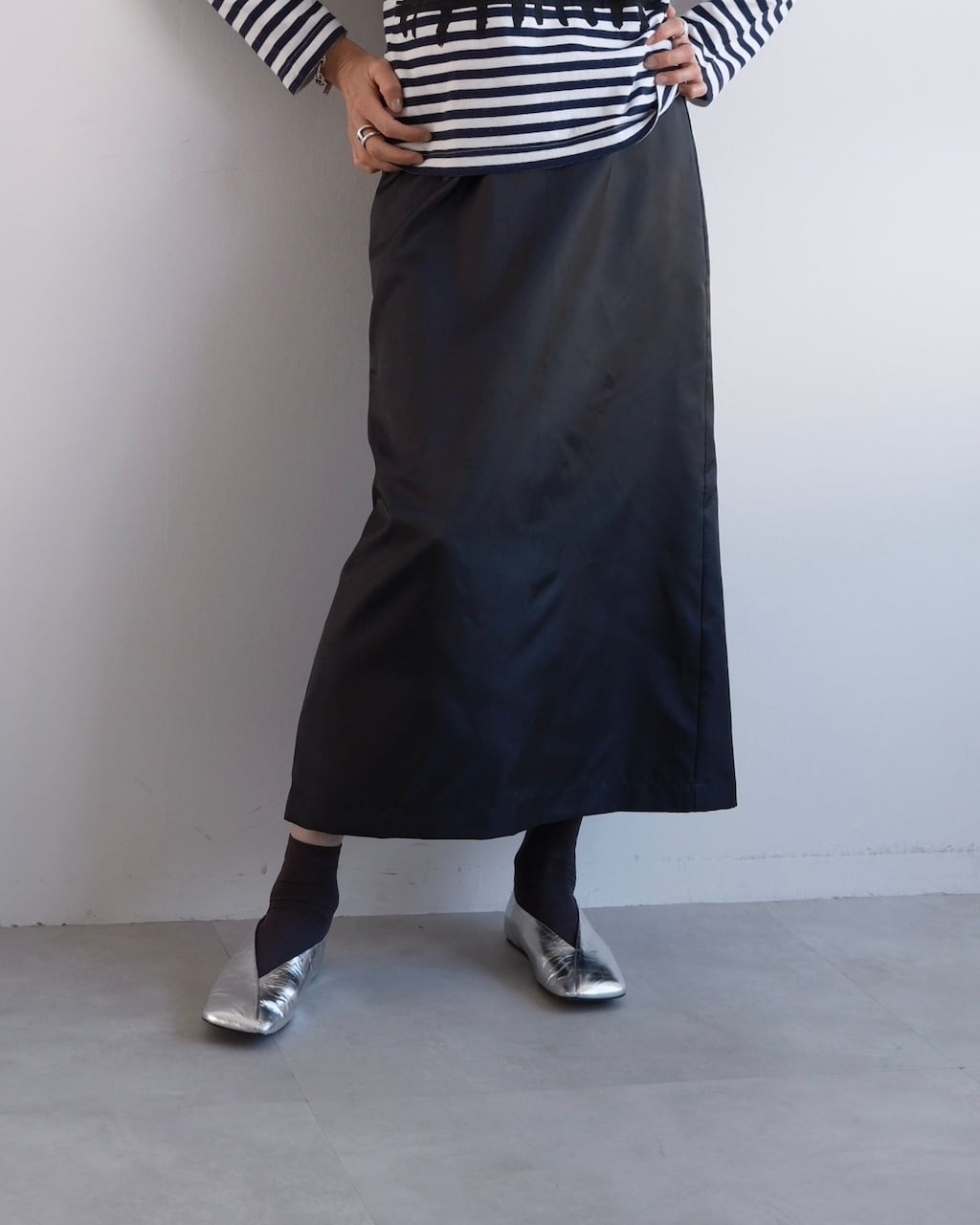 しなやかな光沢を持つポリエステル素材を使用した黒のロングスカート。