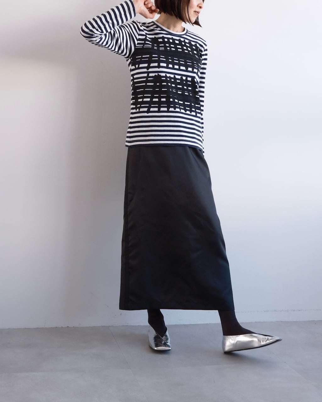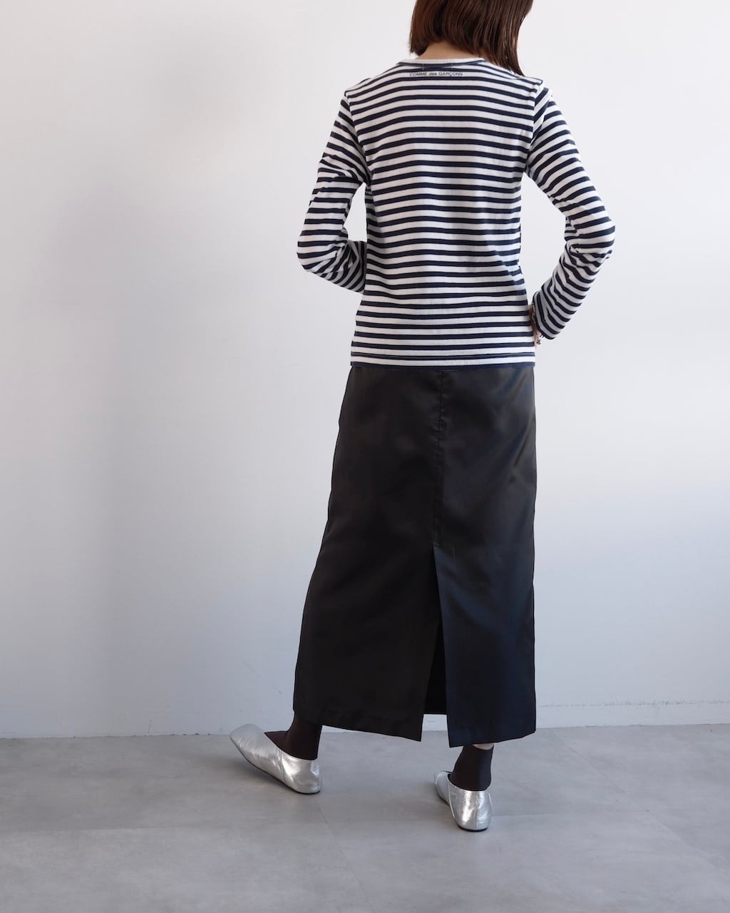 縦に落ちるシルエットと素材の光沢が重なり、シンプルながら存在感のある仕上がりです。