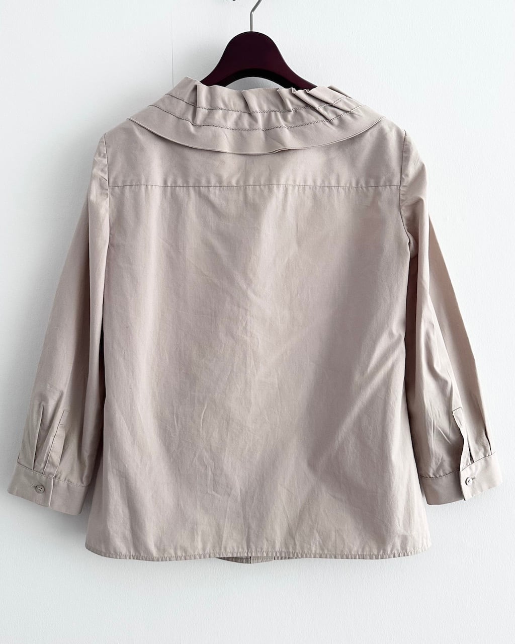 ネックラインに沿って配されたフリルカラーは、段差をつけながら重ねられた立体的な構造。